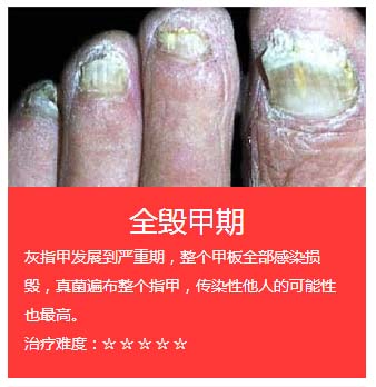【核心导读】灰指甲,医学名为“甲癣”,中医称“鹅爪风”,是种真菌性皮肤病。灰指甲久治不愈,不仅影响患者外观形象,对其生活、社交、工作、心理健康等造成很大负面影响。灰指甲严重的,会并发甲沟炎、甲床炎、手指脓皮病等疾病,甚至产生丹毒或蜂窝组织炎等严重疾病。另外灰指甲还有很强的传染性,一个病甲会逐渐感染两边的健康指甲,时间一长会导致手、足相互感染,严重的十指都被感染;同时灰指甲还能通过间接或直接感染给家人、朋友。>>【点击咨询】<<