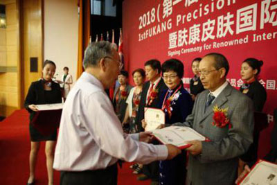 本次大会的另一大亮点就是国内外皮肤医生共同签约肤康皮肤。由肤康总院长吕忠生教授(原北大副校长)与各地三甲医生签约并颁发聘书。